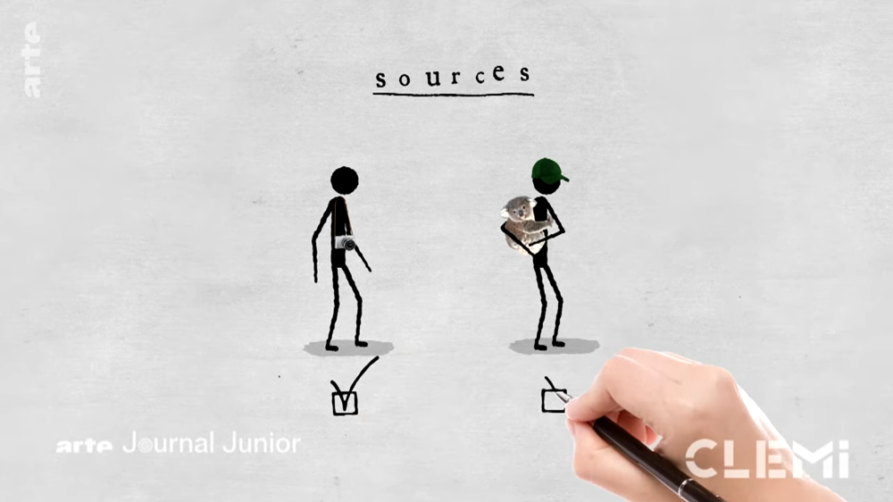 Pour commencer, l’enseignant rappelle aux élèves les éléments de définition d’une information d’actualité (quelque chose de nouveau, qui concerne de nombreuses personnes et qui est vérifié), en insistant particulièrement sur le fait qu’elle doit être vérifiée pour être fiable. Les élèves visionnent ensuite la vidéo ArteCLEMI « Qu’est-ce qu’une source ? » qui explique le rôle qu’elle joue dans le travail du journaliste. Cette vidéo peut être visionnée plusieurs fois, en fonction du niveau de classe, afin de favoriser son explicitation.